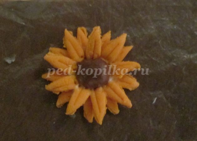 Вокруг шарика смазываем клеем и в шахматном порядке выкладываем еще 9 лепестков.