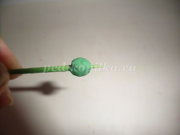 5. Цветок «одевают» на стебель. Для этого кончик зубочисток-стеблей намазывают клеем и накалывают на него цветок. Цветок при этом слегка вдавливается в зеленый шарик - чашелистик.