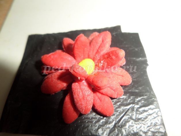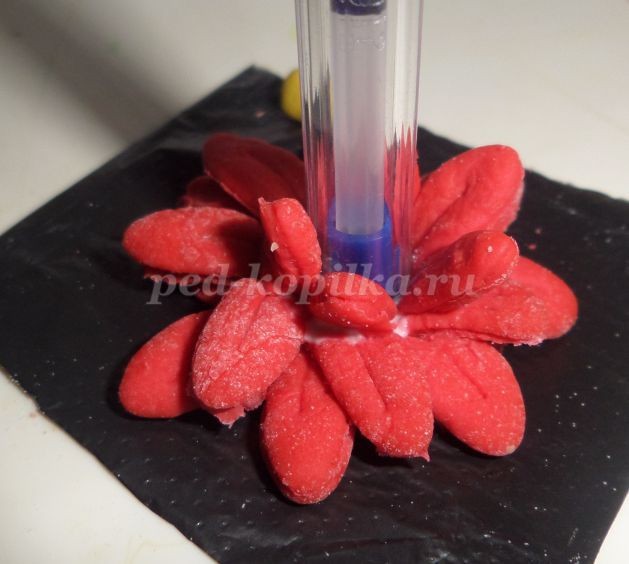 Середину цветка выполняем из теста желтого цвета. Скатать шарик диаметром 3-5 см (можно использовать бусинку). Углубление смазываем клеем и закрепляем середину цветка.
