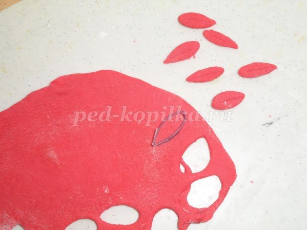 4. Раскатываем скалкой розовое тесто. Вырезаем малой формой-листком 20 – 21 лепесток. Лопаточкой посередине делаем прожилку лепестка.