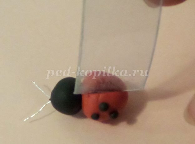 6. Делаем божью коровку. Из кусочков теста красного и черного цвета сформировать два шарика, причем красный чуть больше черного. Место крепления смазать клеем и соединить. Кусочек тонкой проволоки складываем пополам и делаем усики.Лопаточкой посередине туловища делаем надрез. Из черного теста сделать маленькие шарики и закрепить их клеем на крылышках.