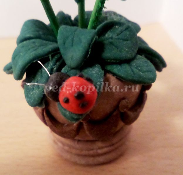 Приклеить божью коровку на листочек цветка, можно приклеить на вазочку.