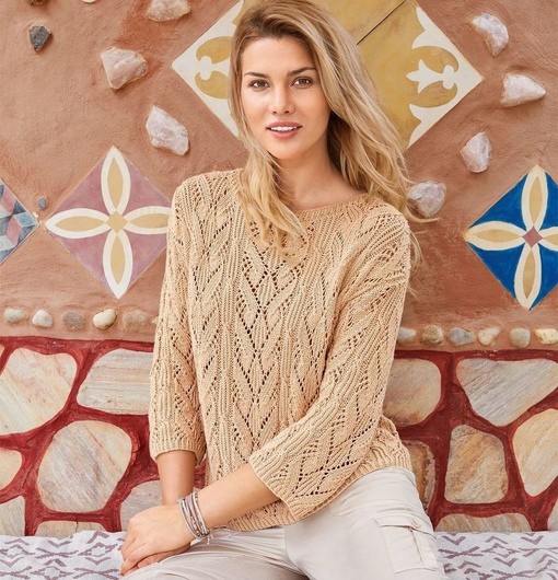 Пряжа (100% вискозы; 175 м/100 г) — 700 г цвета пудры; спицы № 4; круговые спицы № 4.