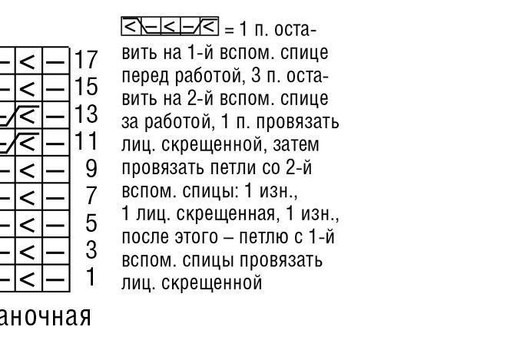 НА 7 П. Вязать по схеме 1. На схеме даны только лицевые ряды. В изнаночных рядах петли провязывать по рисунку, лиц. скрещенные — изн. скрещенными. В высоту повторять с 1-го по 18-й ряд.