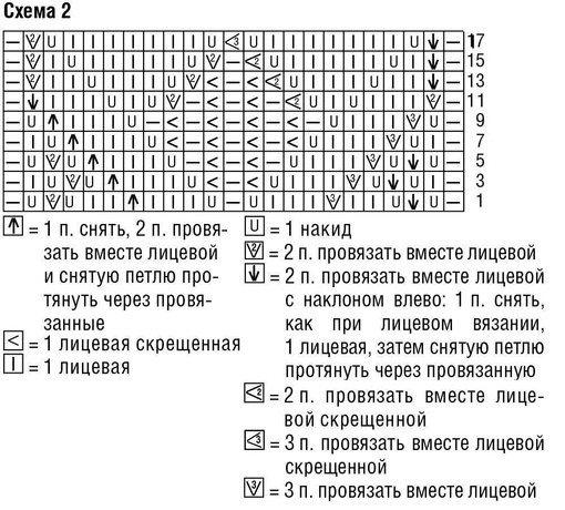 Ажурный узор на 23 п. Вязать по схеме 2. На схеме даны только лицевые ряды. В изнаночных рядах петли провязывать по рисунку, лиц. скрещенные — изн. скрещенными. В высоту повторять с 1-го по 18-й ряд. Важно: при выполнении прибавок и убавок следить за тем, чтобы количество накидов и провязанных вместе петель в ряду оставалось одинаковым.