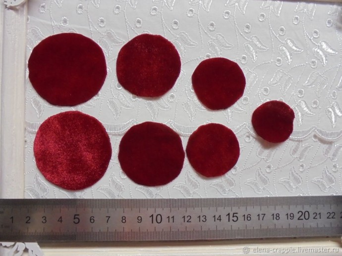 Вырезаем из бархата семь кружков. Один самый маленький и три пары, каждая на 0,5 см в диаметре больше предыдущей пары кружков. Ориентируемся по фото. Размер кружков не пишу. Для начала попробуйте сделать крупную розу, так легче. У меня здесь самый маленький кружок — 2,5 см.