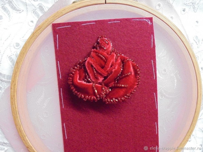 Из одного самого маленького кружка формируем бутон розочки. Подключаем свою фантазию. Складываем кружок так, чтобы по вашему мнению он был похож на бутончик. Пришиваем бутон к центру сложенных кружков, обшиваем его бисером. Думаю, можно добавить и пайетки, и стразики.