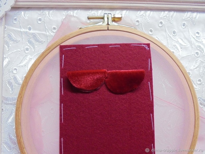 Первую пару маленьких кружков складываем пополам и пришиваем по центру к фетру. Смотрите фото.