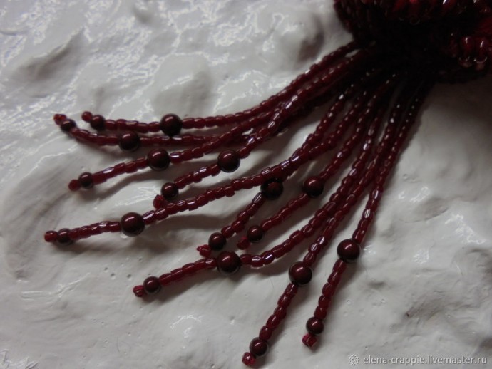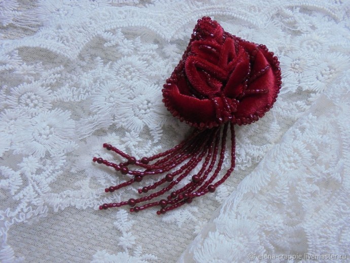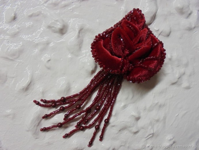 Уже к готовой брошечке я сделала бахрому-подвесочки из богемского бисера и жемчуга Сваровски. Думаю, нечто подобное можно сделать зеленого цвета. Имитировать стебельки и листочки розы.