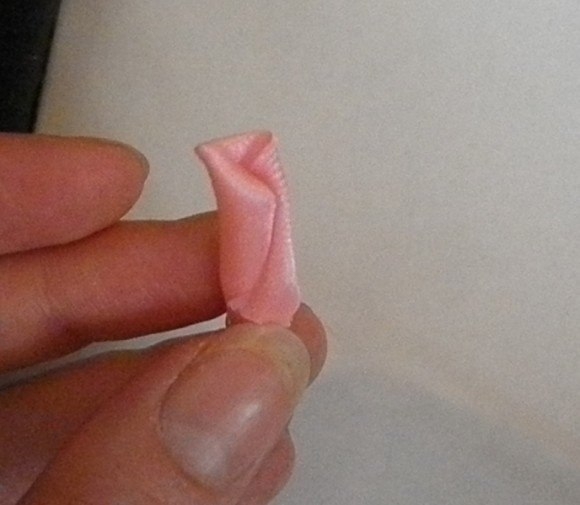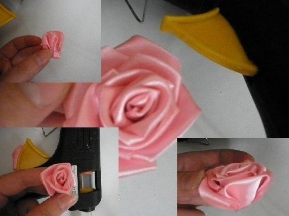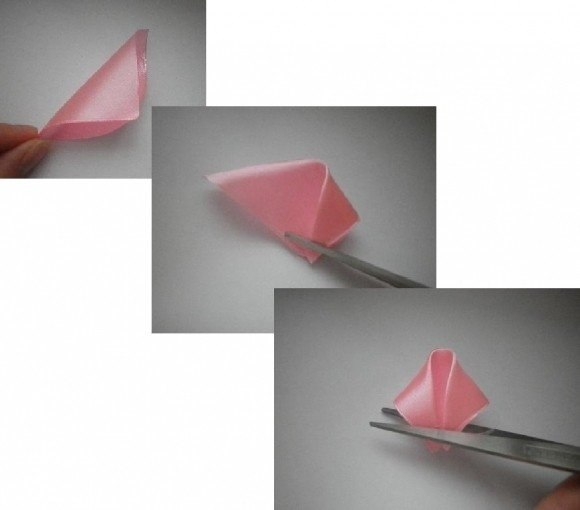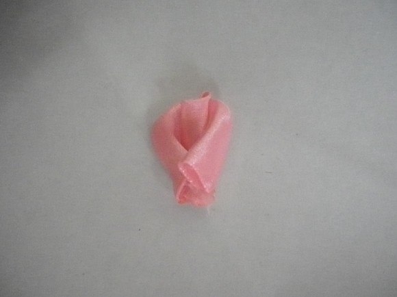 Роза в технике канзаши: мастер-класс, часть 3Автор Кудрякова Ольга.17. Берем еще две маленькие заготовки и приклеиваем их к нашему бутону напротив друг друга. У нас получился вот т...