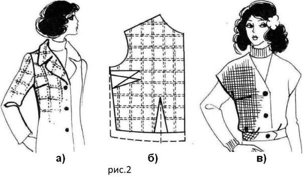 При работе с клетчатыми тканями надо особое внимание уделять оформлению вытачек лифа, так как по линии стачивания вытачек рисунок клетки меняет своё направление, искажается, что не всегда красиво. Оформлять вытачку следует с учетом конструкции изделия в целом, не нарушая композиции модели. Случайное искажение рисунка портит внешний вид изделия, поэтому преломление клеток должно быть продумано и проверено. Начнем с классической вытачки, идущей от плечевого среза, характерной для костюмов строгой формы типа тайер (рис.1, а).