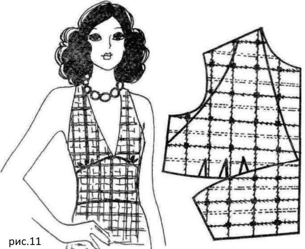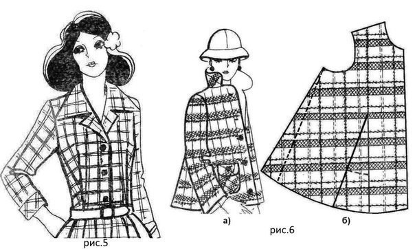 2. Рисунок клетки может иметь полукосое направление с обеих сторон линии вытачки, если полосы или клетки сходятся «елочкой» (рис.5). Такое расположение рисунка клетки по линии вытачек у талии создает зрительное впечатление более стройной фигуры (талия кажется уже). При таком варианте расположения вытачек по линии талии, в случае ярко выраженной несимметричности рисунка ткани, одна из вытачек (левая или правая) будет отличаться от другой. Чтобы скрыть этот недостаток, вытачку можно закрыть клапаном или карманом.