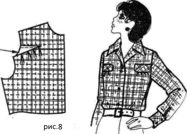 Вытачку можно заменить мягкой встречной складкой, что дает возможность использовать ткань с несимметричным односторонним рисунком: в мягкой складке несоответствие рисунка в вытачках менее заметно. В платье свободной формы с вытачками из горловины (рис.7,б) по линии вытачек с одной стороны сохранено долевое направление рисунка клеток (этого можно достичь только на тканях с симметричным рисунком клеток). Такое направление вытачки можно использовать и в лифе с большим вырезом (летнее платье, блуза). В клетчатых тканях вытачку из проймы применять не следует, так как рисунок клеток по линии вытачки совпасть «елочкой» не может, происходит некрасивый излом клеток. Если необходимо использовать такую вытачку, то ее можно закрыть накладным клапаном или карманом. Верхнюю вытачку можно перенести в подрезы со сборками v линии проймы (рис.8). Линии подрезов закрыты клапанами, так как в местах подреза рисунок некрасиво искажается.