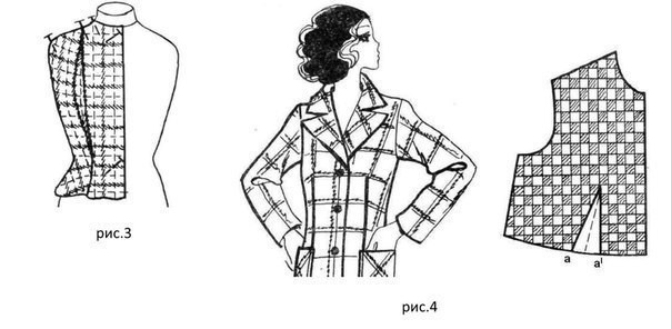 Чтобы придать лифу мягкую форму и в случае необходимости сделать напуск ткани по линии талии, вытачку по линии талии заменяют защипами или равномерно расположенными сборками (рис.2,в). При выкраивании лифа свободной формы с напуском боковой срез делают прямым и прибавляют припуск к длине на напуск (см. пунктирную линию на рис.2,б), на котором показана выкроенная полочка лифа с вытачкой от бокового шва. В изделиях, плотно прилегающих к фигуре, кроме верхних вытачек в лифе, делают вытачки по линии талии. Если верхняя вытачка может менять свое направление, то вытачки по линии талии занимают более определенное положение. Вытачки по линии талии в изделиях прилегающей формы оформляются таким образом, чтобы рисунок клетки совпал «елочкой» (рис.3).