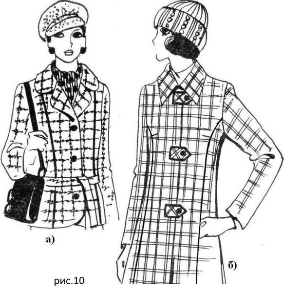 В жакете по линии верхней вытачки на одной стороне, ближе к центру лифа, рисунок клетки сохраняет долевое направление, а на другой стороне, у проймы, он расположен по косому направлению. Чем больше величина раствора вытачки, тем больше и искажение рисунка Нельзя рекомендовать оформление вытачки, когда рисунок клетки по линии стачивания вытачки имеет с обеих сторон косое направление (рис.1,б). Нельзя рекомендовать подобное оформление вытачки при изготовлении изделия из тканей с несимметричным рисунком клетки; в этом случае несоответствие рисунка по линиям вытачек и правой и левой частях лифа будет очень резко выявлено. В изделиях из тканей с несимметричным рисунком вытачки лучше перемещать под пройму. Верхнюю вытачку с небольшой величиной раствора (в пальто и жакете) можно расположить ближе к вырезу горловины при условии, если она будет скрыта лацканом или воротником. Верхняя вытачка может быть застроченной или заменена мягкой складкой. В изделиях из клетчатых тканей большое значение придается направлению рисунка. Имеется большая возможность пользоваться спецификой рисунка клеток. Изменение рисунка, его преломление на местах вытачек можно использовать для обогащения формирования лифа. Чтобы сохранить вверху лифа долевое направление клеток, можно применять другие вытачки, при которых рисунок клеток вверху лифа не будет искажен. Самой распространенной верхней вытачкой в легком платье, и частично и в верхней одежде, является вытачка, направленная под пройму. При оформлении этой вытачки следует придавать ей горизонтальное направление, сохраняя с одной ее стороны такое же горизонтальное направление рисунка, делая скос только с другой стороны вытачки (рис. 2,а).