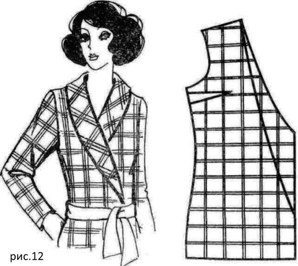 В лифе с полочками, находящими одна на другую (рис.12), долевая нить располагается по центру лифа, линия запаха идет по косому срезу. Вытачка находится под проймой, в боковом шве.