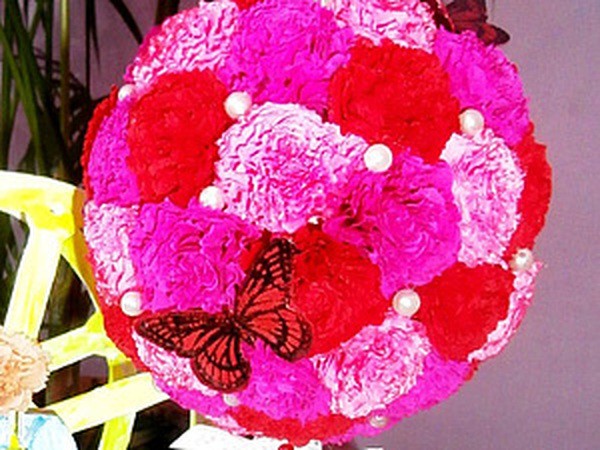 14. Приклеиваем цветы на шар. Используем горячий клей. Начинать лучше ни с самой макушки шара, а немного сбоку, чтобы цветы смотрелись клумбой, не выделяя один.