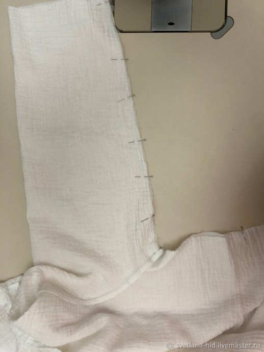 Складываю боковой шов, совмещаю нижний срез рукава, пройму и низ бокового шва. Прокладываю строчку , обметываю со стороны полочки.
