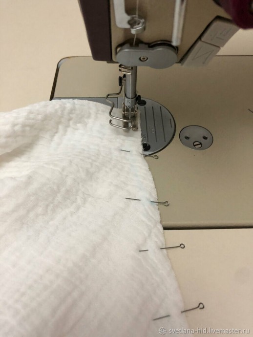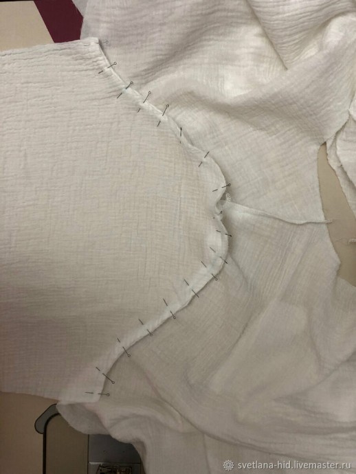 Раскладываю перед со спинкой лицевой стороной вверх, так чтобы пройма была направлена на иглу машинки. Вкалываю рукав или сметываю в пройму, совмещаю рассечки по окату рукава и проймы.