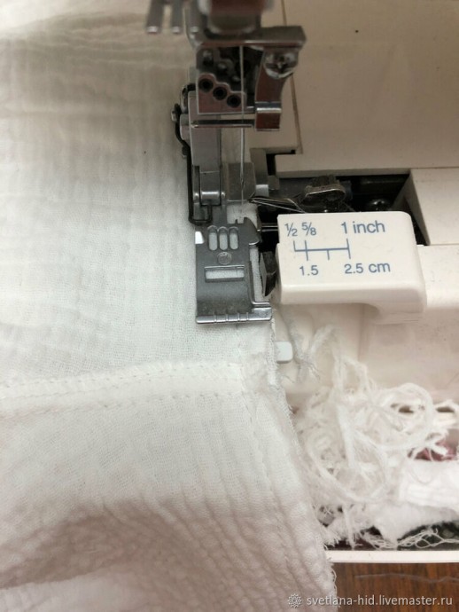 Проверяю шов рукава, все поправляю, прокладываю строчку по окату рукава, обметываю на коверлоке. Заутюживаю шов рукава в сторону полочки и спинки.