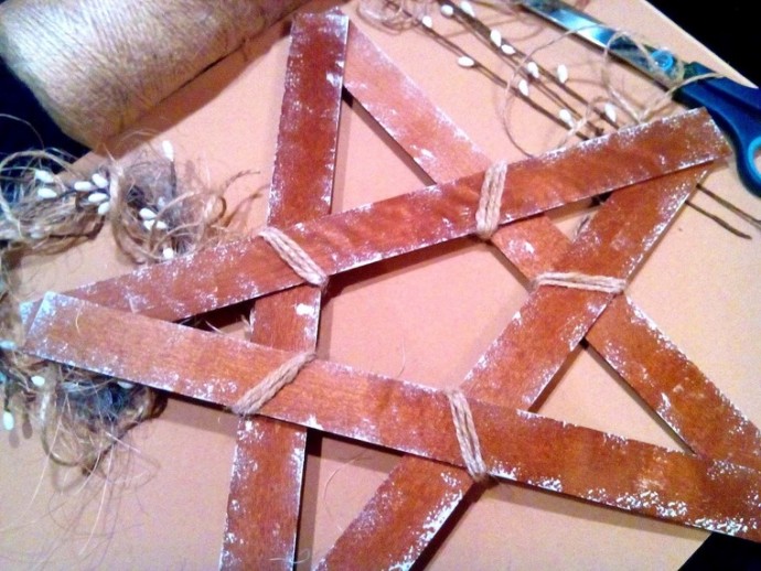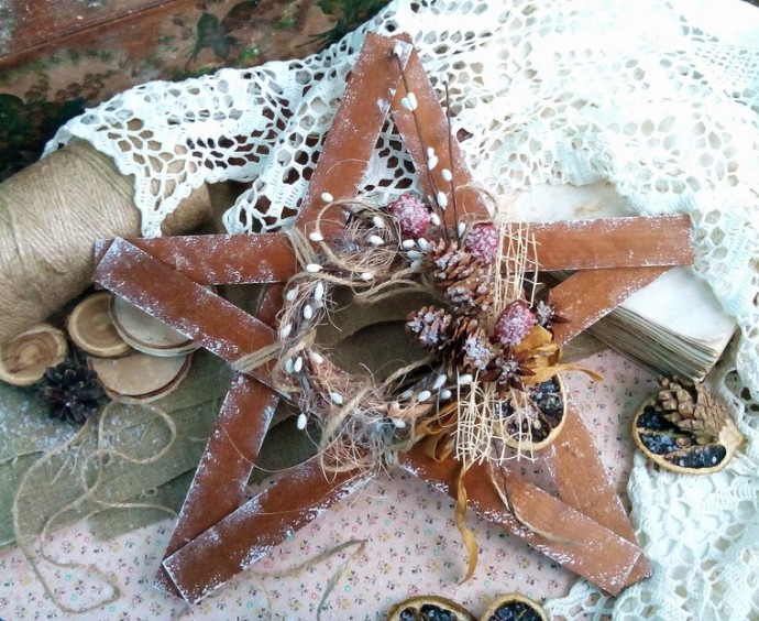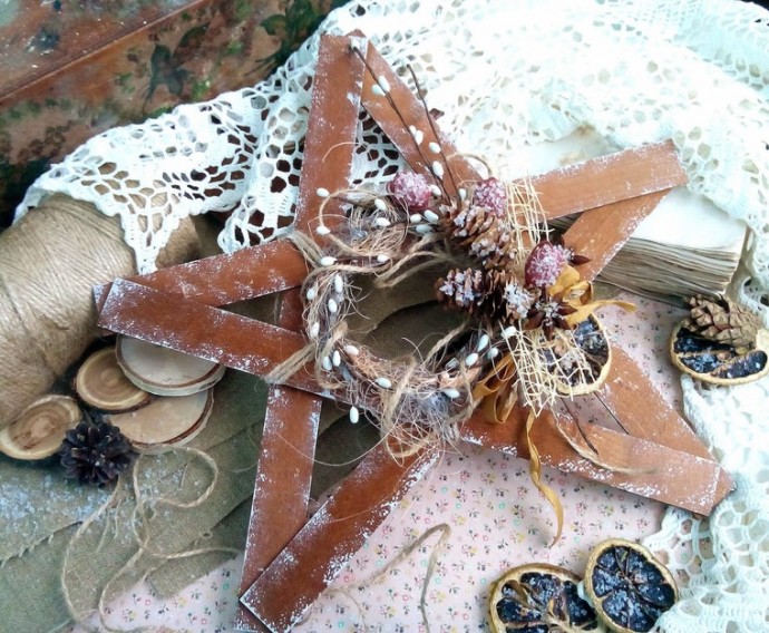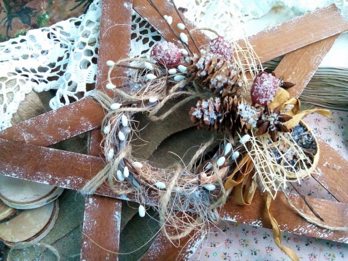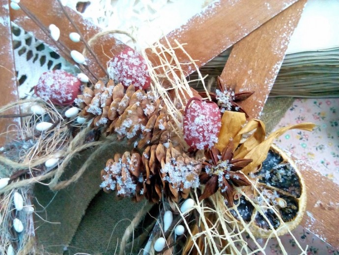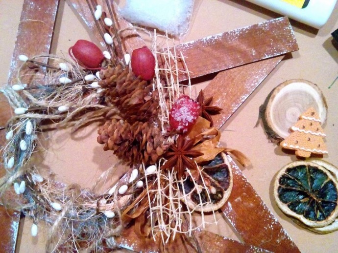 Приклеиваю задуманную композицию к венку, а венок на звезду. Добавляю звездочки бадьяна и искусственный снег. Снег приклеиваю на клей ПВА.