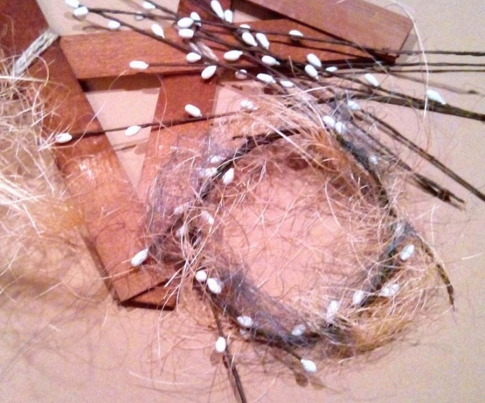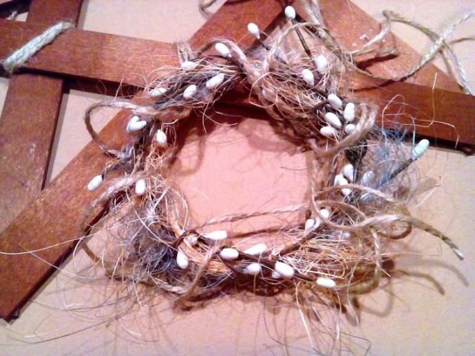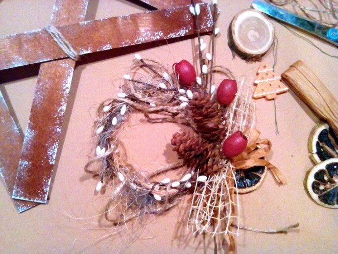 Снова добавляю веточки и неплотно обматываю бечевкой, чтобы она лежала свободными кольцами. Основа веночка готова