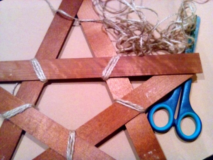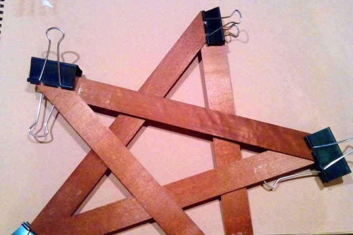 Склеиваю концы линеек в форме звезды, закрепляю канцелярскими зажимами, чтобы детали хорошо приклеились.
