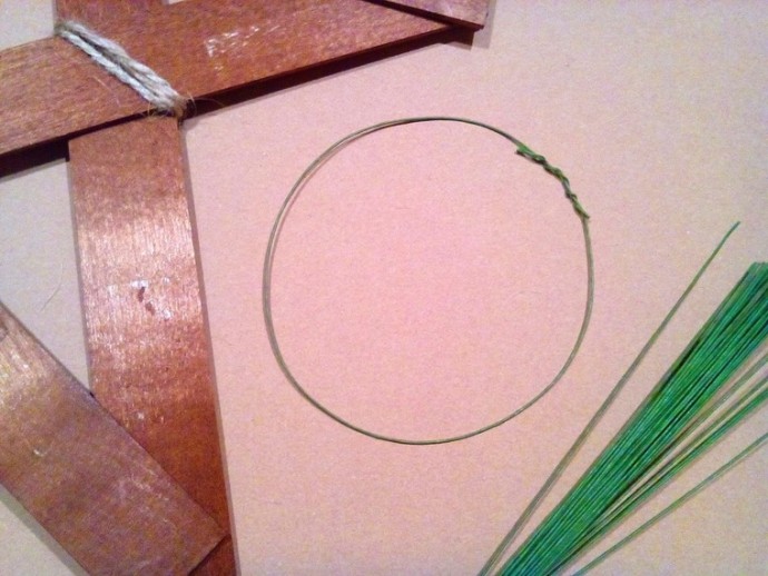 Теперь нужно сделать центральный элемент звезды — венок. Для этого флористическую проволоку смыкаю в кольцо.