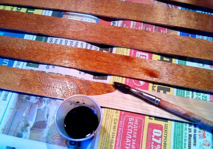 Сначала нужно подготовить линейки, я покрываю их морилкой при помощи кисти. Делаю это несколько раз, нанося новый слой на уже высохший предыдущий, до тех пор, пока интенсивность цвета меня не устроит.