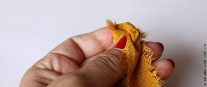 Люблю отрывать, получаются такие лохматые края, я же делаю бохо :) Завязываю кончик в узелок и начинаю вокруг него заворачивать ткань.