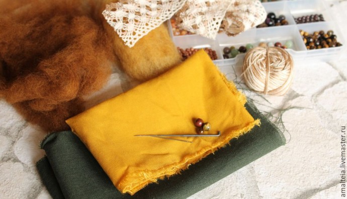 Самое главное в моем процессе изготовления брошей — это подборка материалов. В перечне я так кратко написала — ткани лен, вискоза, кружево… А когда я начинаю делать брошь — у меня гора всяких кусочков-лоскуточков, кружева, и я подбираю иногда целый вечер, а иногда и два, и только тогда начинаю работать. Причем, в процессе я опять могу заменить один лоскуток на другой, выбрать другое кружево или другие бусины. Но это процесс очень «интимный», в этом мастер-классе уже все подобрано и только собрать все это вместе.