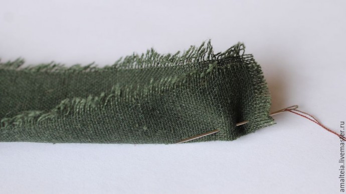 Беру зеленую полосочку, она тоже оторвана, а не отрезана, такая лохматенькая, ее складываю, но не пополам, а верхний край чуть короче нижнего, как бы два слоя получается и начинаю собирать на нитку.