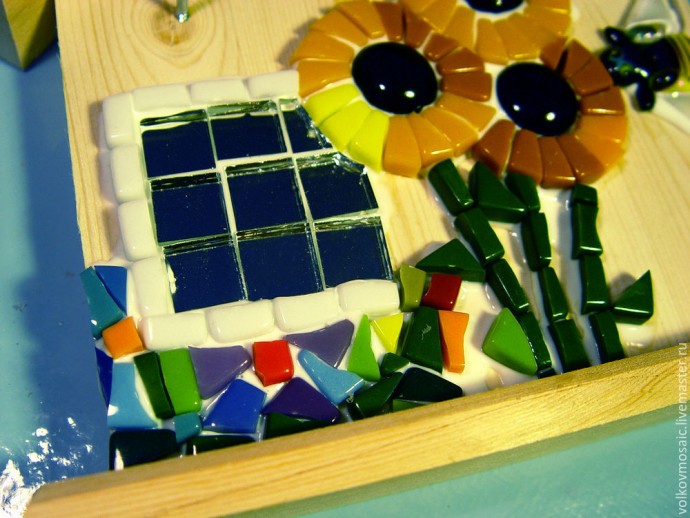 После того как были приклеены стебли подсолнухов, надо было решить, что будет слева и справа от цветов. Ключница имеет форму домика. Какой дом без окна?