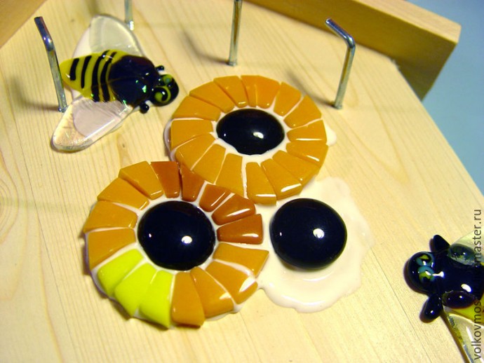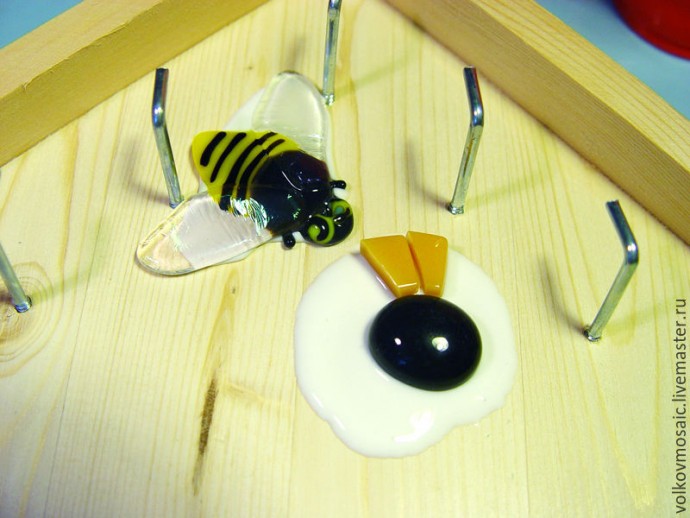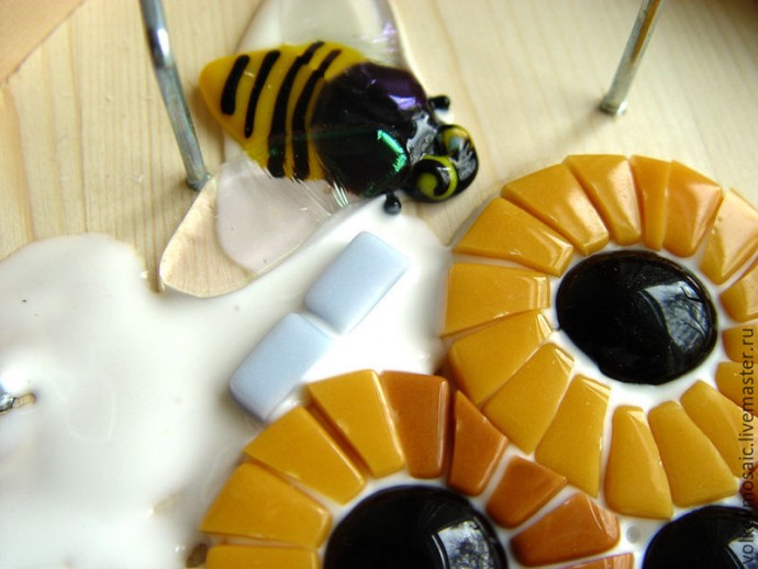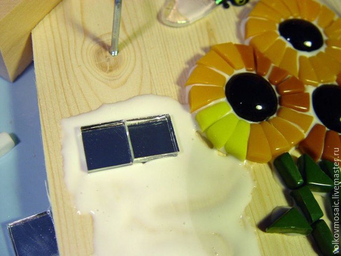 Расколола щипцами желтую смальту по форме трапеции. Намазала клеем небольшой участок деревянной заготовки в том месте, где будет первый цветок. Выложила кусочки смальты узкой стороной вокруг черного марблса.