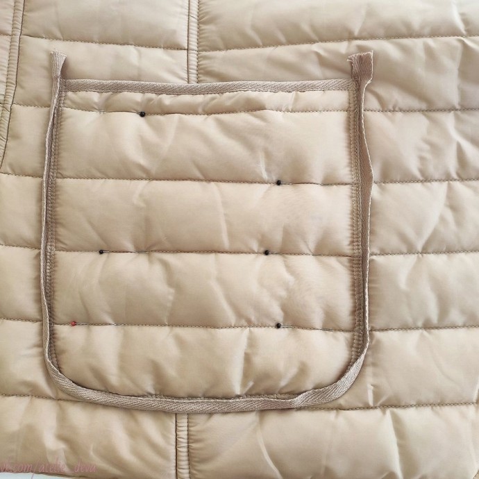 1.приколоть булавками (приметать)на изнаночную сторону кармана 1 сторону ленты к верхнему срезу кармана на расстоянии 0,5см.