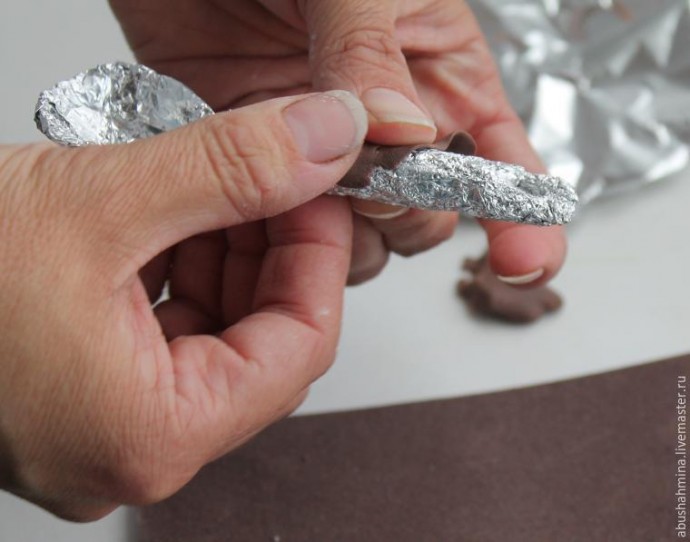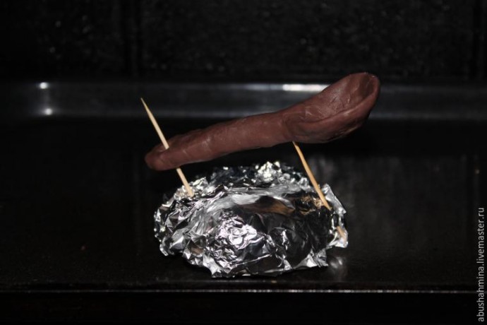 По моей задумке в композиции должна присутствовать небольшая ложечка вкусного шоколадного цвета. Здесь я использую пищевую фольгу как основу и полимерную глину. Ложечка получилась небольшая, около 10 см в длину. В рукоятке делаю небольшое отверстие. Полимерную глину разминаю, делаю тонкие «лепешки» и укрываю ложечку из фольги. Следы, вмятинки и неровности помогает скрыть зубочистка.