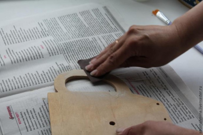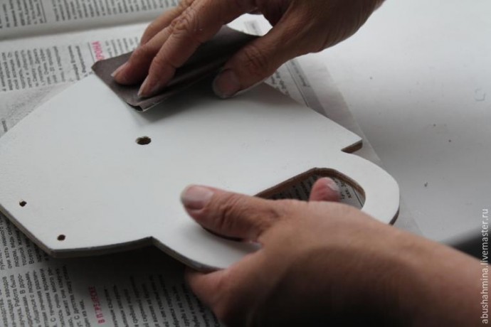 Осматриваю заготовку, ищу дефекты и шпатлевкой устраняю их. После высыхания шкурю. На моей заготовке дополнительной было заказано мастеру 3 небольших отверстия по низу- для пущей красоты, для декору