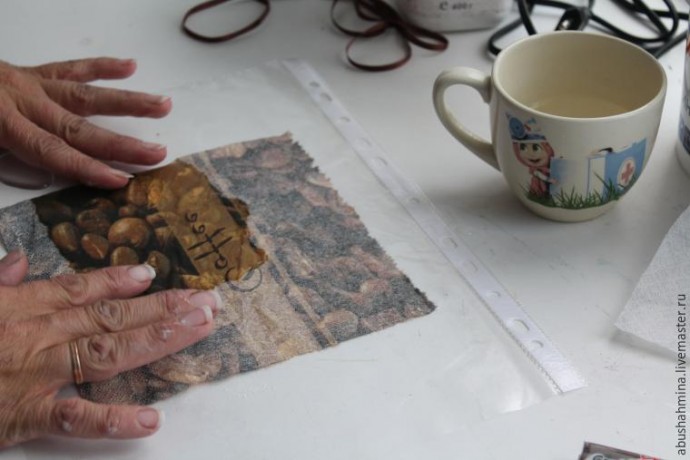 Переворачиваю файл с салфеткой, сливаю излишки воды и картинкой вверх накладываю на заготовку. Прозрачный файл позволяет сделать это ровно, симметрично, без промашек. Проглаживаю файл ладошкой, выгоняя воздух и аккуратно начинаю приподнимать один из уголков файла. Салфетка должна остаться на месте.