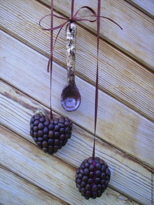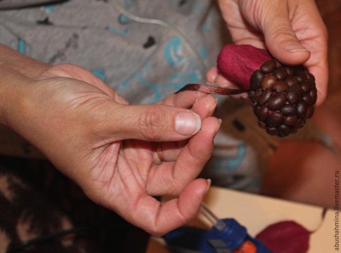 Клею на термопистолет зерна кофе. Начинаю сверху, от ленточки, плотными рядами.