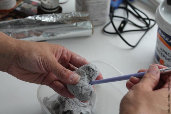 Теперь на помощь приходит плоская синтетическая кисть и клей. У меня это Кива от Тиккурила. От центра начинаю наносить клей по салфетке аккуратно, мокрая салфетка легко рвется. Пока сохнет салфетка, примемся за декор. Понадобится бумага — это могут быть бумажные полотенца, однослойные салфетки. Чем ниже сорт, тем лучше для массы папье-маше. В емкость с водой опускаю бумагу, добавляю ПВА и формирую массу для лепки, отжав излишки воды. Я леплю небольшое сердечко и кофейное зерно, примерно 4-5*6 см. Острым предметом в верхней части заранее делаю углубление около 1 см. Ура зимним батареям! Они позволяют высушить слепленные заготовки за 1-2 дня. Не забудьте между поверхностью батареи и слепленной игрушкой положить полиэтилен или файл и переворачивать заготовку в процессе сушки.