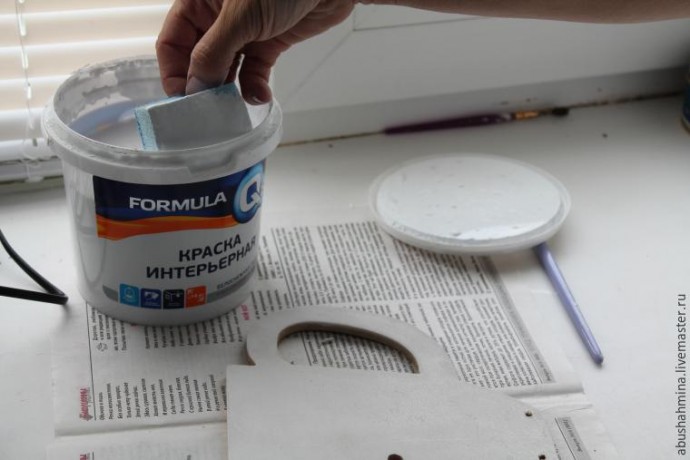 Грунт сохнет очень быстро, через 20-30 минут проверяем и если все высохло, шкурим. Следующий этап — нанесение акриловой краски губкой или спонжем равномерно в 1 или 2 слоя с просушкой. Краску я беру в строительных магазинах: акриловая воднодисперсионная для внутренних работ. Ведерка на 0,8-1,0 кг хватает надолго.