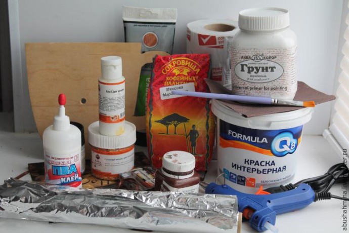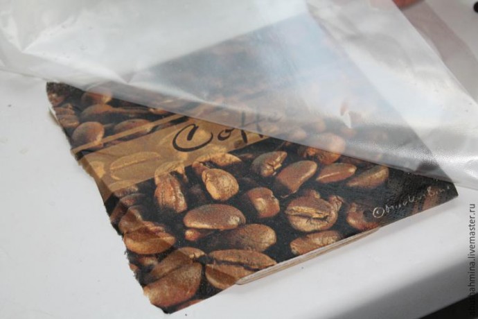 Сердечко и кофейное зерно успели высохнуть. В углубление вклеиваю узкие атласные ленты длиной около 1 метра Покрываю их однослойной однотонной салфеткой при помощи ПВА. Идельно бы подошла салфетка коричневого фона, но у меня была только бордовая. Это основа под наклейку живых зерен кофе. Вот такой промежуточный результат.