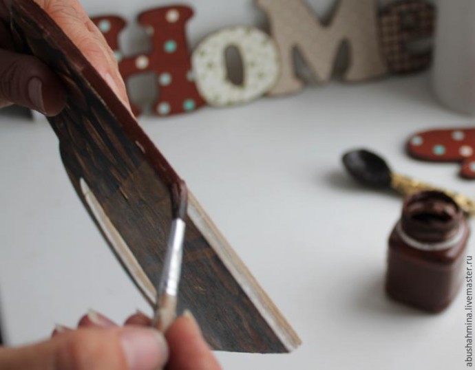 Заканчиваю оформлять саму основу с часами: шкурю края и поверхность. Окрашиваю торцы коричневым акрилом. Лакирую.