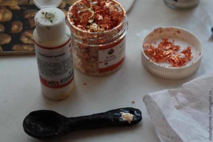 Декрирую ложечку золотом. Поталь в хлопьях очень удобна. Здесь на фото я только начала процесс медитации (=приклеивания хлопьев). Одновременно крошками золота я покрыла 4 самых крупных зерна из моей упаковки. Готовый результат чуть ниже