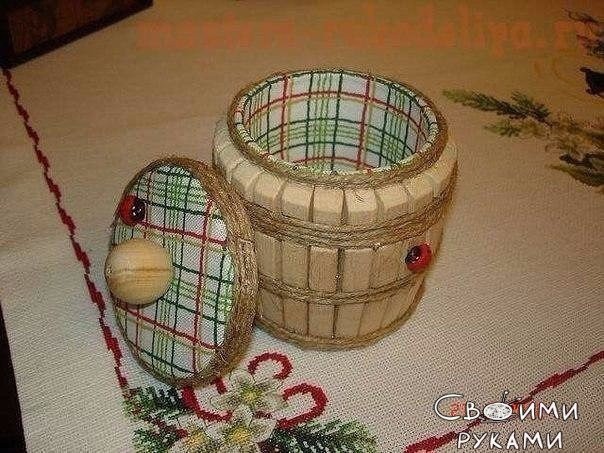 Бочонок из прищепокТакой бочонок из прищепок своими руками станет незаменимым декорирующим элементом для каждой кухни.