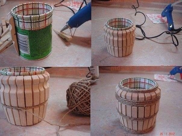Бочонок из жестяной банки и деревянных прищепокБочонок из жестяной банки и деревянных прищепок это талант творить экологичные вещи, используя вторсырье.