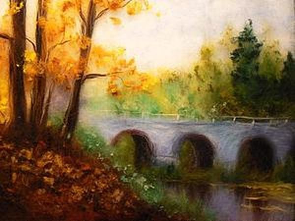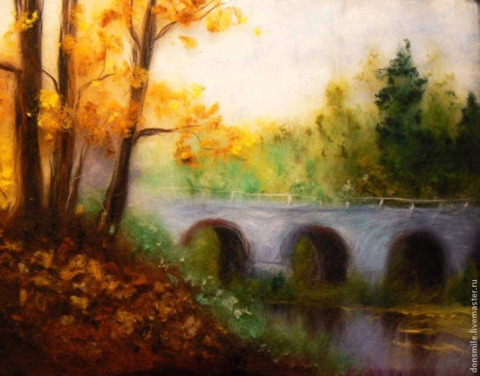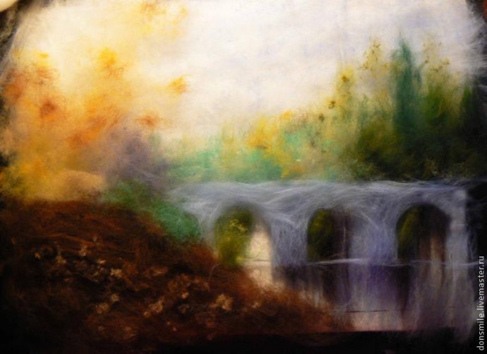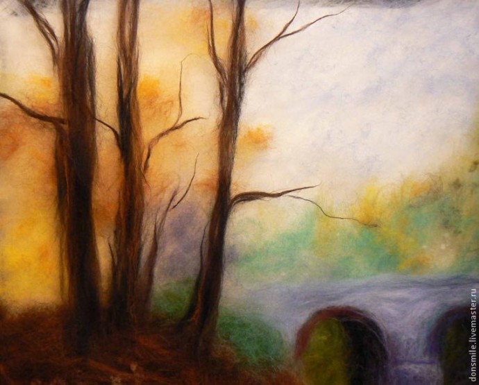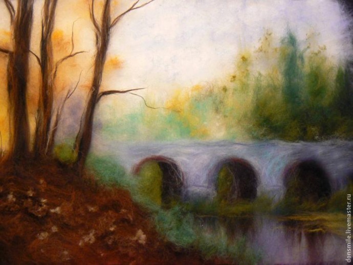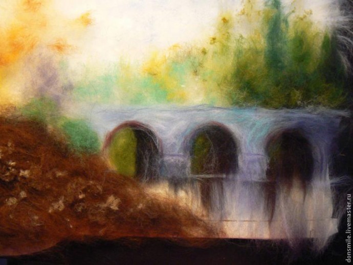 Деревья, которые находятся на заднем плане, а также растительность над мостом, намечаем самой светлой шерстью (зелёная, бирюзовая, салатовая). Здесь идеально подойдёт крадочёс, но если его нет, подойдёт и гребенная лента.