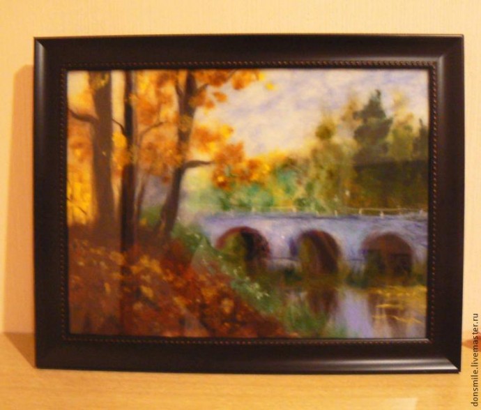 Перед тем, как накрыть картину стеклом, внимательно проверяем, правильно ли лежат все элементы картины, снимаем скрепки, которыми мы крепили ткань (если они есть). Убедившись, что нас всё устраивает, накрываем работу стеклом, затем рамой. Загибаем «гвоздики» на раме, срезаем лишнюю ткань и шерсть.