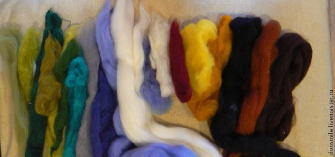 Этот метод работы с шерстью называется «вытягивание». Держим гребенную ленту в одной руке, а пальцами другой руки вытягиваем белую шерсть небольшими тонкими клочками и кладём её на основу хаотично.