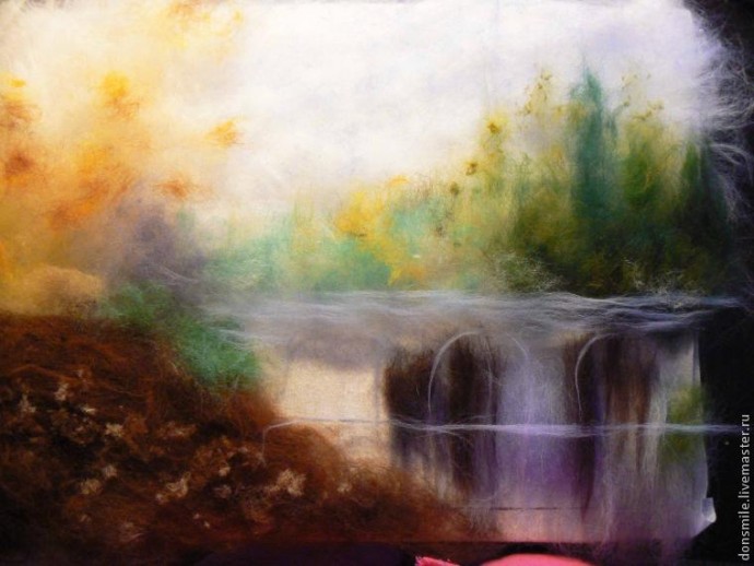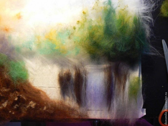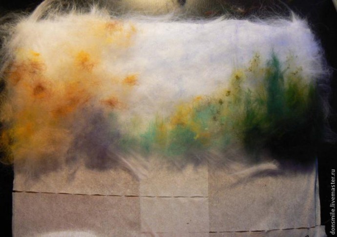 В технике «Шерстяная акварель» шерсть выкладывается послойно. Начинаем с верхнего края картины (с неба).